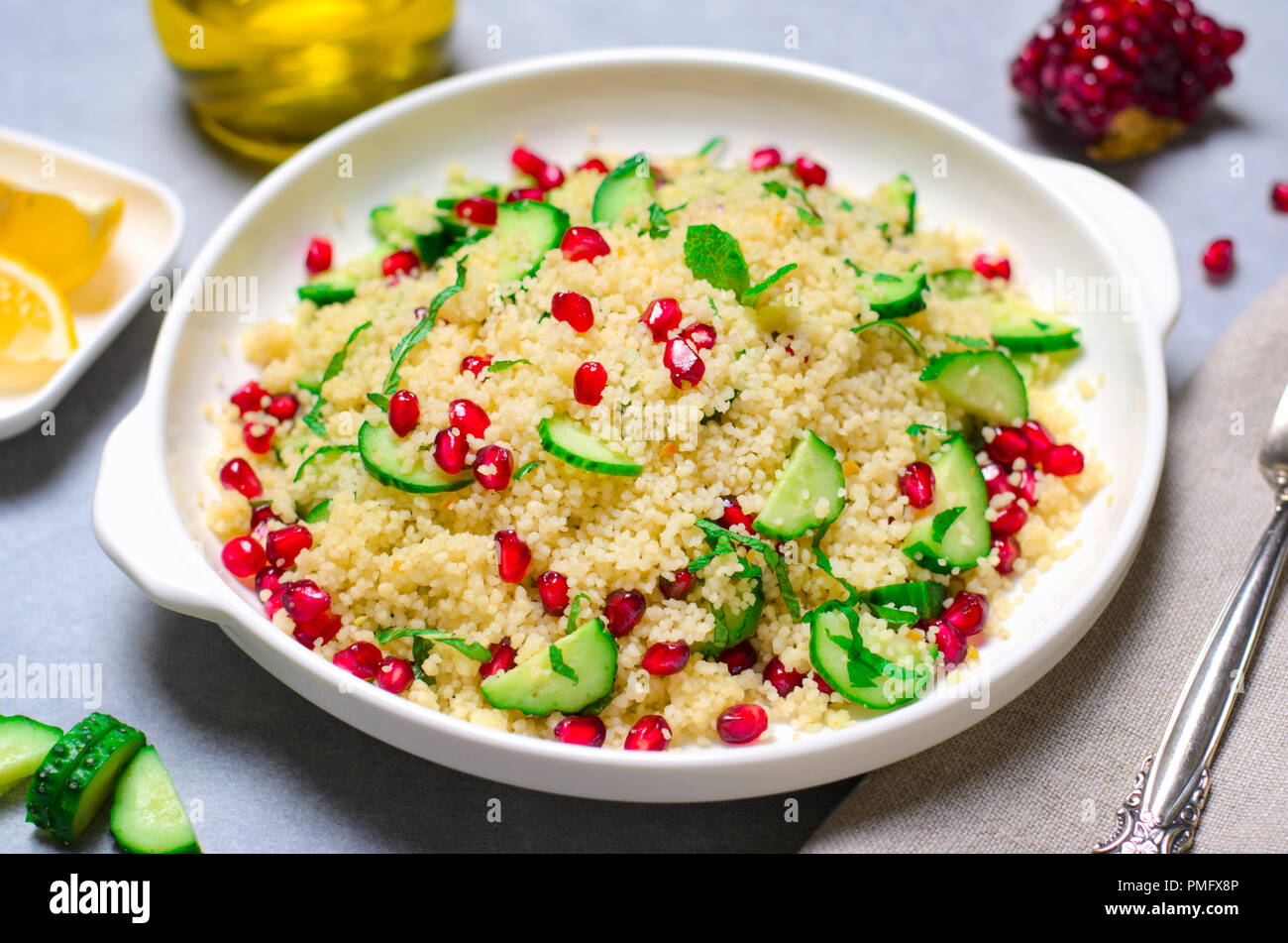 In a large bowl, mix 1 ½ tablespoons of olive oil with the couscous, using your hands, until all the grains are coated. Couscous has always been a weird one for me. Your couscous lemon pomegranate stock images are ready. Finely chop the mint and cilantro, combine with the prepared couscous, season with lemon juice and crushed garlic, salt and pepper to taste, mix thoroughly. Skim off the membrane and then pour the seeds through a strainer.
